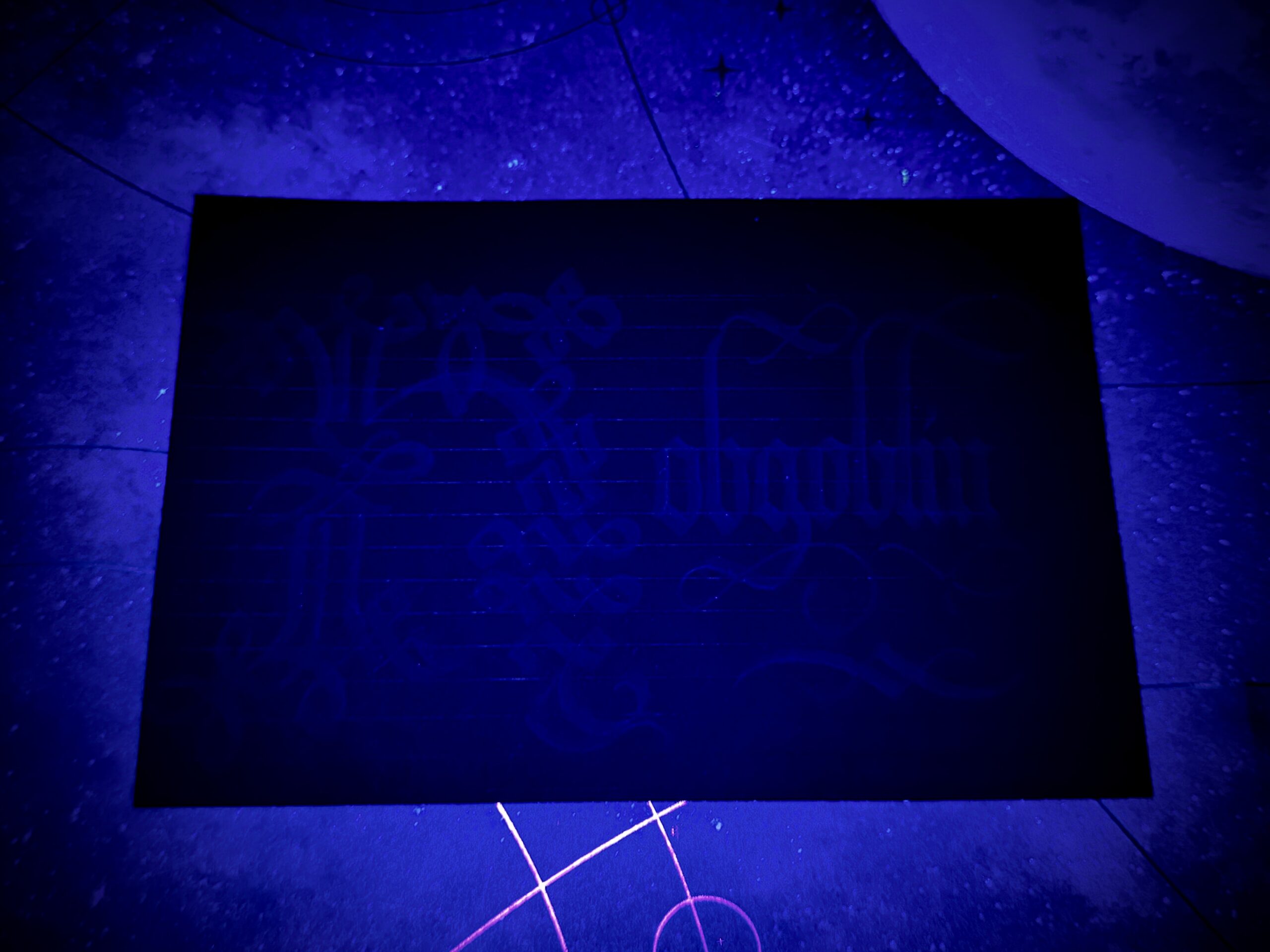 This is some mystery blacklight invisible ink from the Goblin Trader at the Ohio Renaissance Festival on Fabriano Black Watercolor paper and written with 3mm parallel nib.